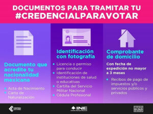 Para tramitar la credencial del INE los interesados tiene que llevar un documento que acredite la nacionalidad mexicana como el acta de nacimiento o la carta de naturalización; una identificación con fotografía como la licencia de conducir, cartilla del servicio militar, identificación ante instituciones de salud o educativas o la cédula profesional; y comprobante de domicilio con fecha de expedición no mayor a 3 meses.