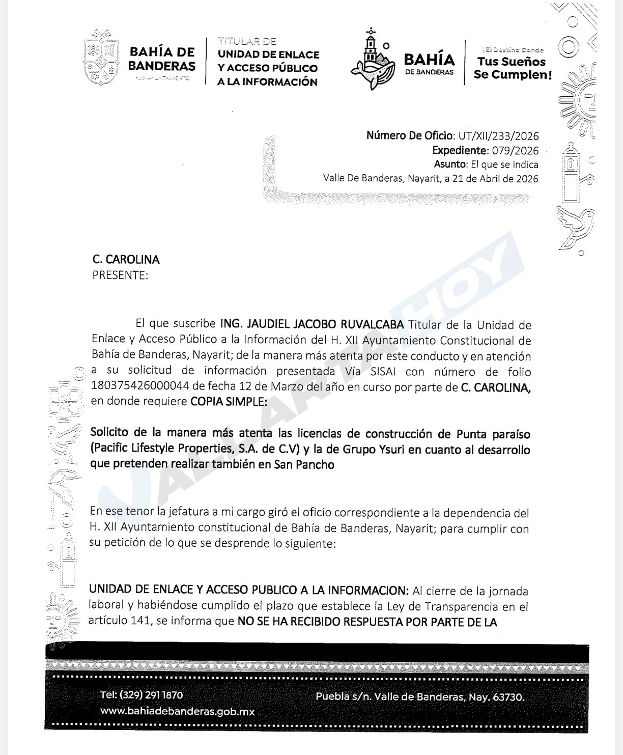 La Dirección de Desarrollo Urbano del Ayuntamiento de Bahía de Banderas, cuyo titular es Julio Santoyo, ni el intento hizo de transparentar la licencia de construcción del desarrollo Ysuri, el cual se pretende edificar en San Pancho y mismo que estaba en el centro de la polémica antes del atentado contra el ambientalista Erik Saracho. Simplemente el Gobierno de Héctor Santana ignoró la petición de la Plataforma Nacional de Transparencia.