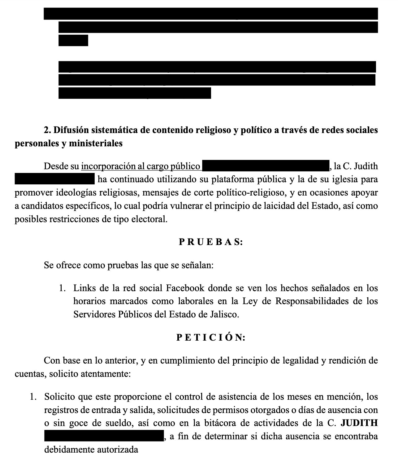 “La hoy denunciada es servidora pública y ha participado de forma reiterada en eventos religiosos y actividades ministeriales durante su jornada de trabajo, lo cual se presume contrario a su obligación de cumplir con su horario y funciones laborales como servidora pública”, se lee en la queja.