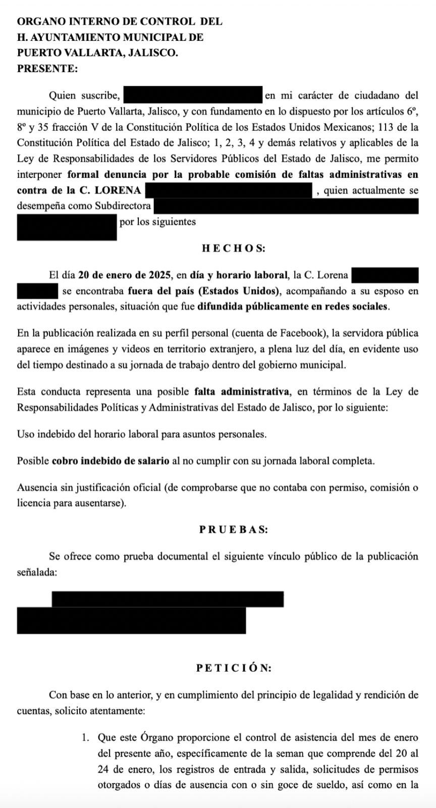 El Contralor Municipal Rene Madero confirmó que este viernes fueron enviadas a través de un correo electrónico oficial dos denuncias contra funcionarias municipales de Puerto Vallarta: la coordinadora general de Secretaría General, Judith “N”, y la subdirectora de Emprendimiento de la Dirección de Promoción Económica y Turismo, Lorena “N”.
