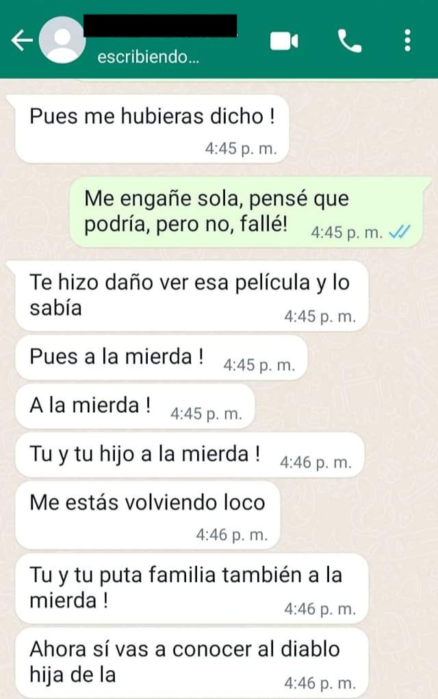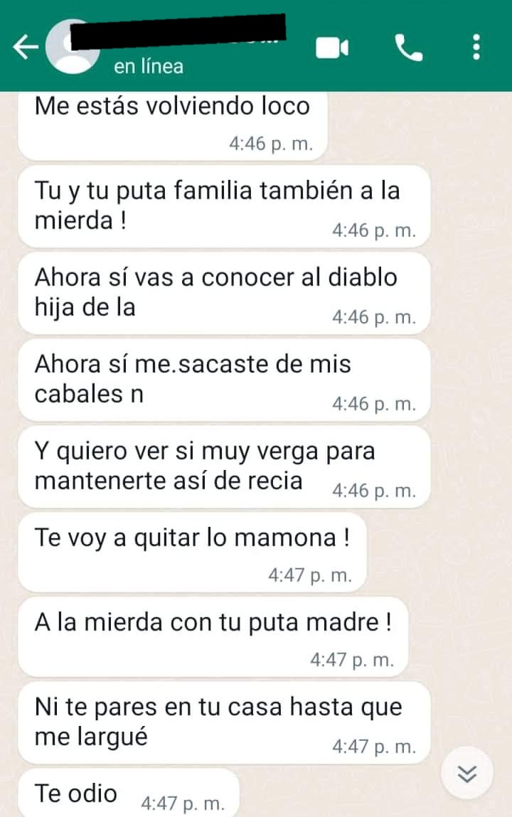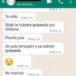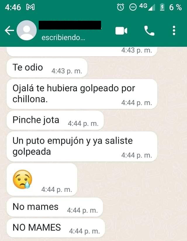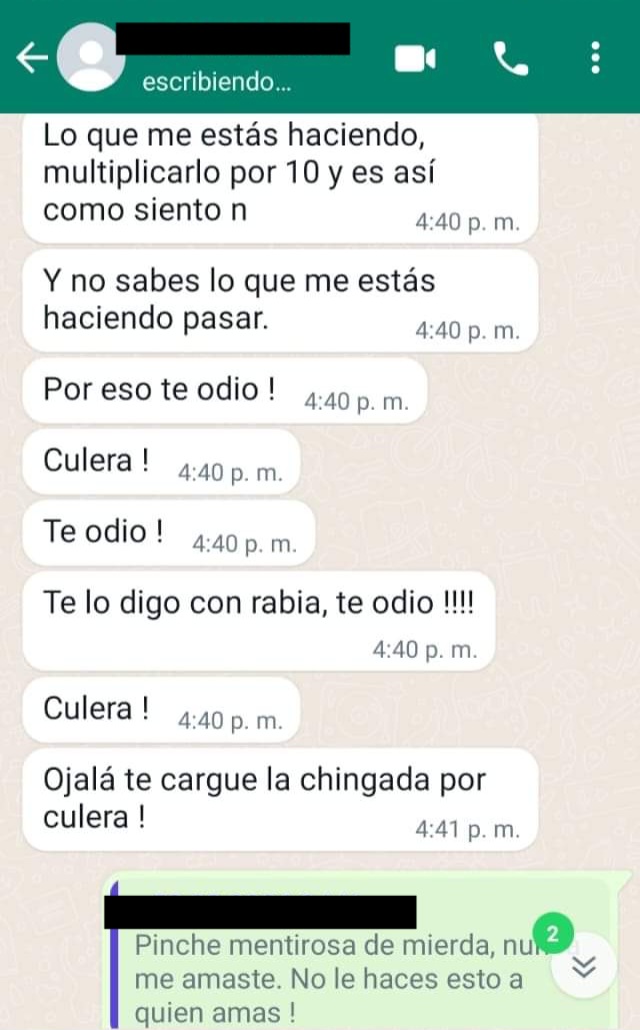 En entrevista mostró un video de cómo la ahorca con ambas manos, audios dónde se escucha que la quiere matar: “Quiero matarte, juro que me las vas a pagar, a nadie había odiado tanto en mi vida, no voy a descansar hasta chingarte, sin meterme en pedos chinga tu madre perra”, además de incontables mensajes de whatsapp donde le dice que la odia.
