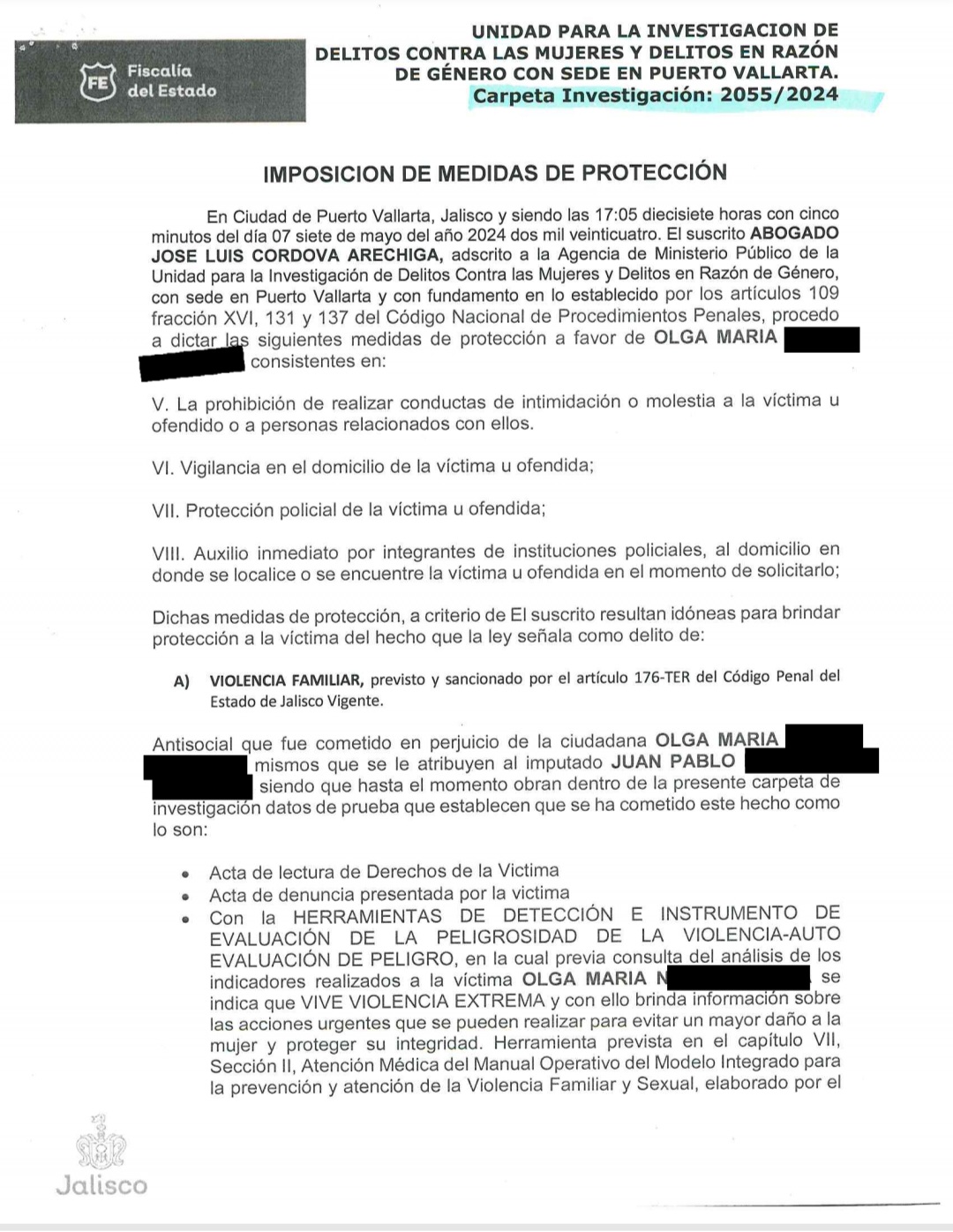 Pero llegaron los gritos, palabras altisonantes y los golpes, lo que la orilló a poner una primera denuncia, de la cual no dio continuidad porque la amenazaba con quitarle al bebé y de muerte y no tenía a ningún familiar cerca. Fue hasta marzo del 2024 cuando se armó de valor y presentó una segunda querella por violencia familiar y amenazas en el Centro de Justicia para Mujeres de Puerto Vallarta y con ello tuvo acceso a medidas cautelares para que Juan Pablo no se le acercara.
