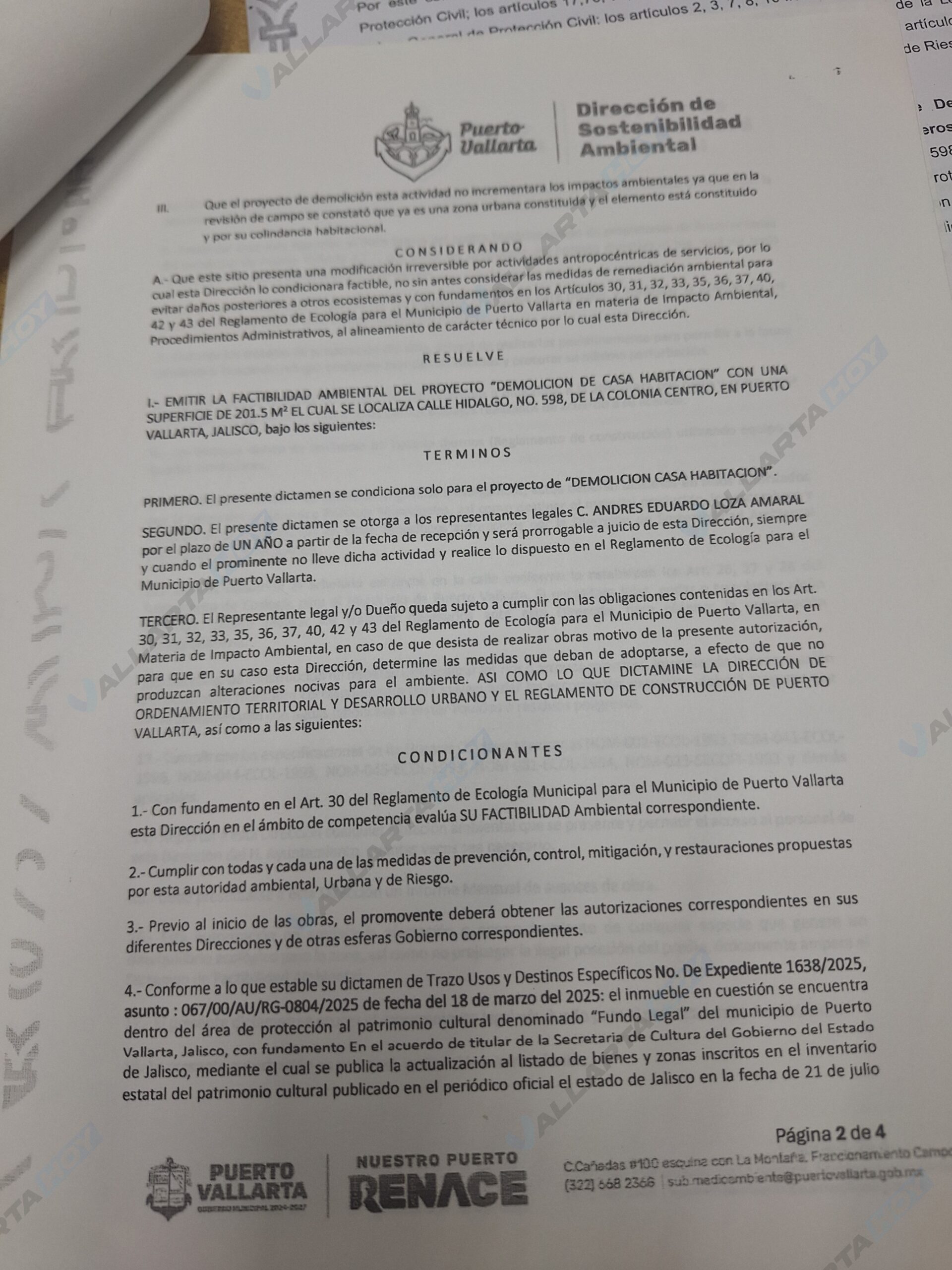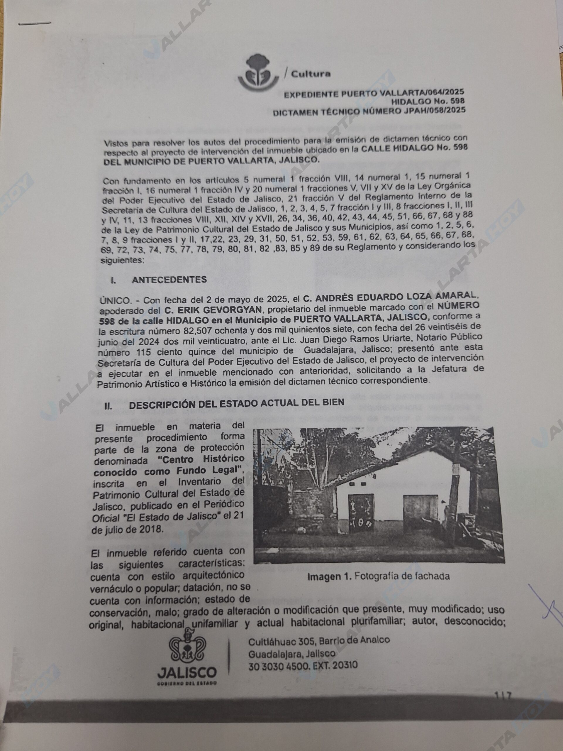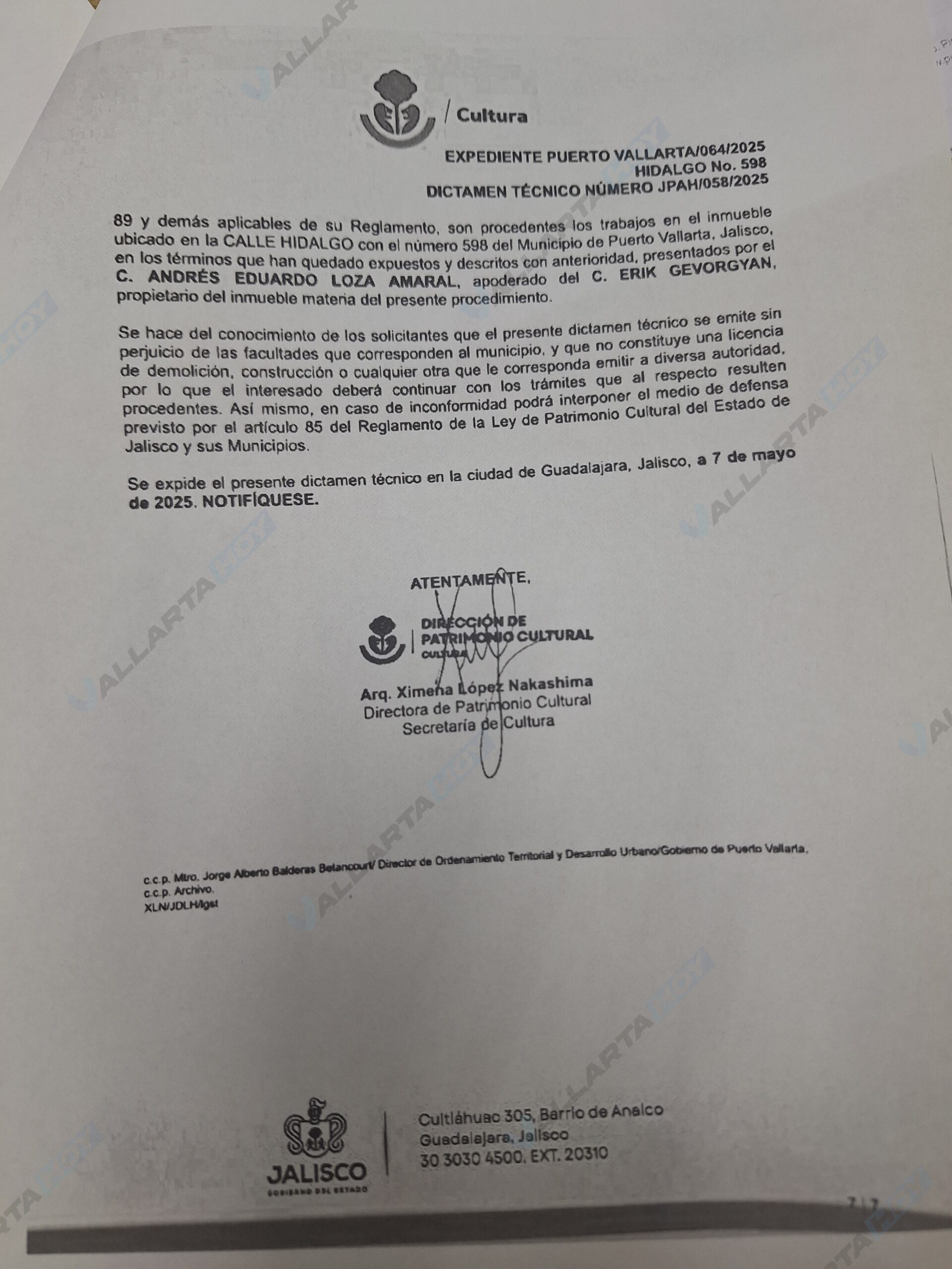 No obstante, el visto bueno de la Secretaría de Cultura de Jalisco fue firmado desde el 07 de mayo pasado por Ximena López Nakashima, directora de Patrimonio de dicha secretaria. El dictamen técnico obra bajo el número JPAH/058/2025 donde se consideró que la finca no posee elementos de valor patrimonial, afecta la imagen urbana y presenta problemas estructurales graves que representan un peligro para la población u otras casas.