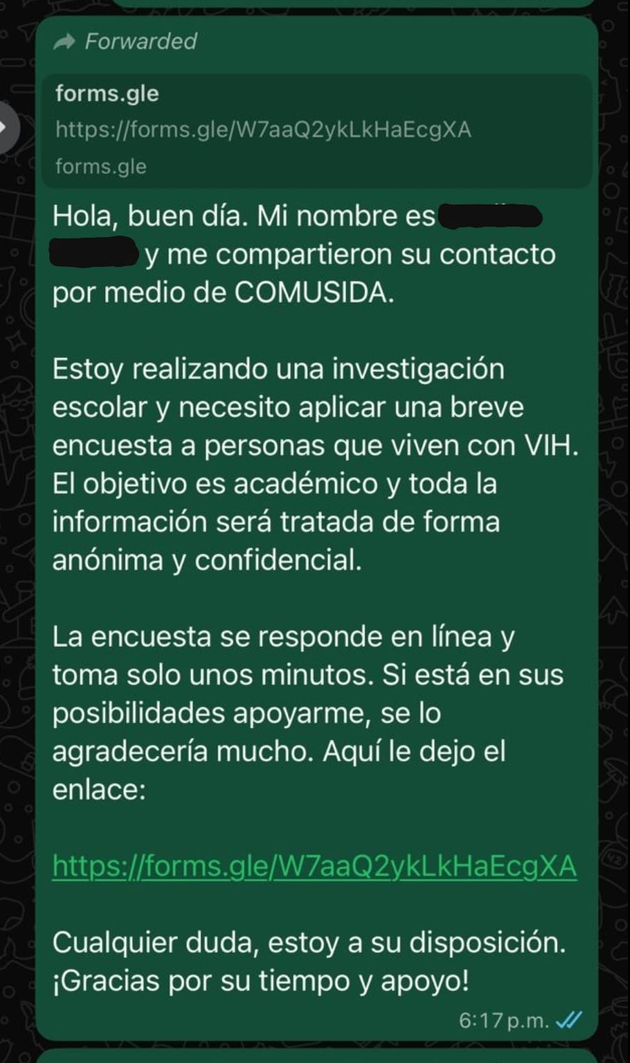 Contactada por las organizaciones, la estudiante confirmó que recibió los datos directamente de la coordinadora de COMUSIDA, quien estuvo de acuerdo en que persona externas a la dependencia aplicaran el cuestionario, por razones de tiempo.