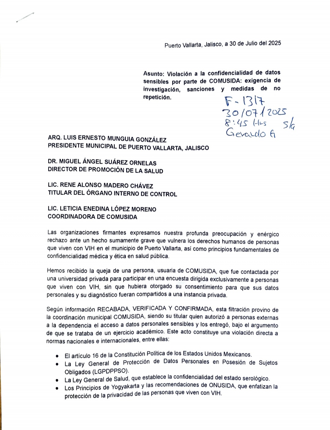 Este hecho representa una violación a la Constitución, a la Ley General de Protección de Datos Personales, a la Ley General de Salud y a principios internacionales que protegen la privacidad de las personas que viven con VIH.